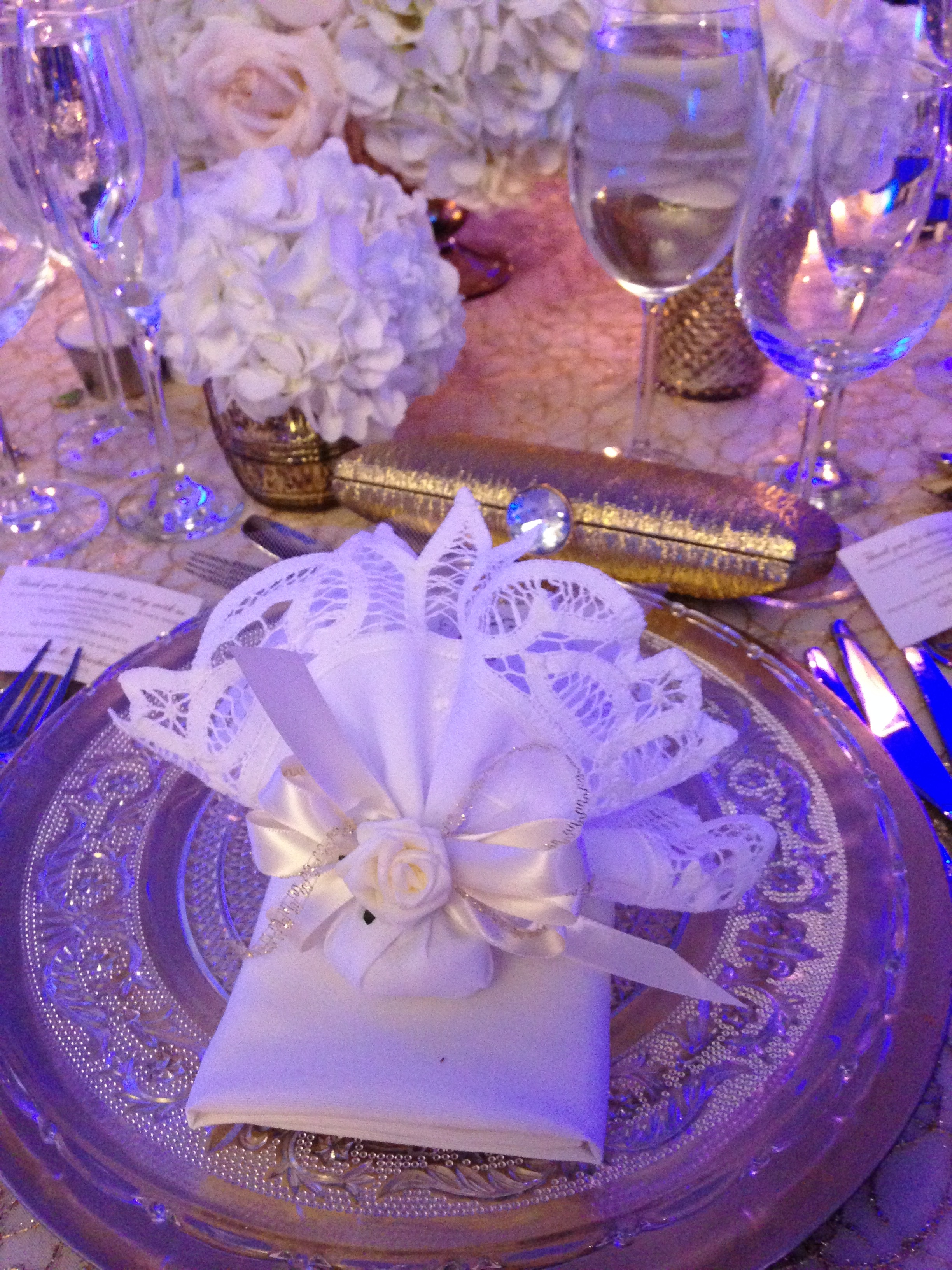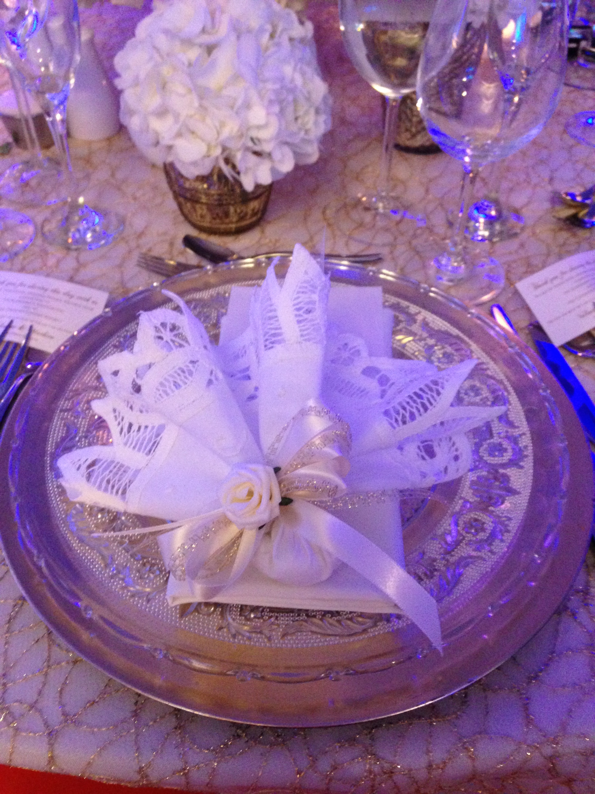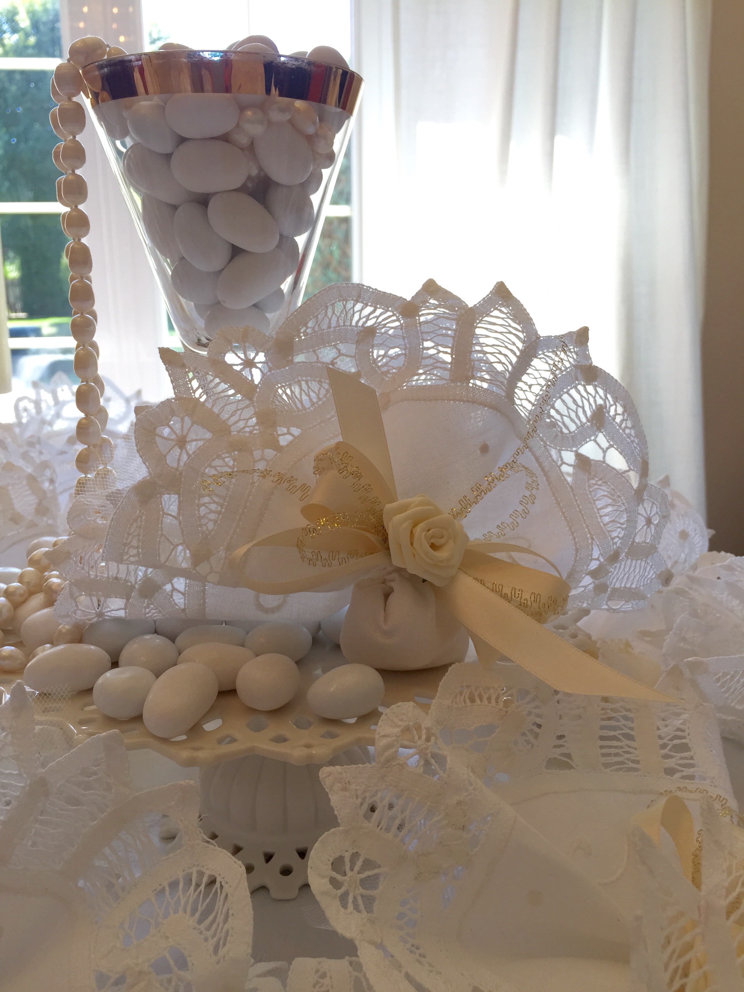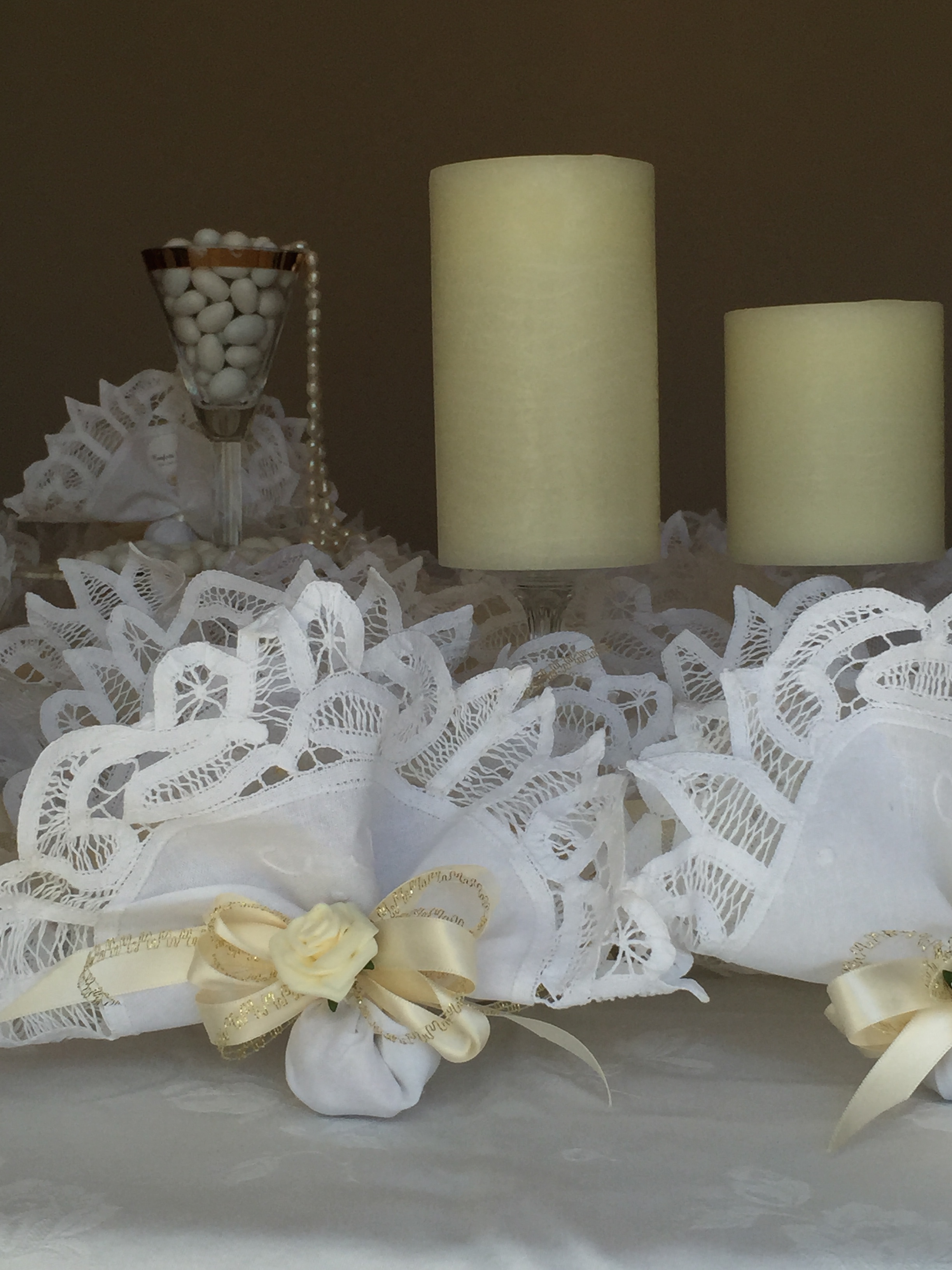 Every place setting had Italian Flavoured Confetti individually wrapped in Lace Linen handkerchiefs. This special couple made a donation to a charity they believed in and each bomboniere had a tag telling their guests that a donation was made in lieu of a gift. They still went home with delicious confetti and traditional linens.